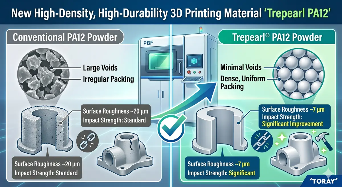 Toray announced in February 2026 the development of "Trepearl PA12," a highly spherical polyamide 12 (PA12) powder designed for powder bed fusion (PBF) 3D printers. By leveraging its proprietary particle-shaping technology, the company has more than doubled impact strength while reducing surface roughness to approximately one-third of that of conventional materials. Sample shipments to select customers began in January 2026.